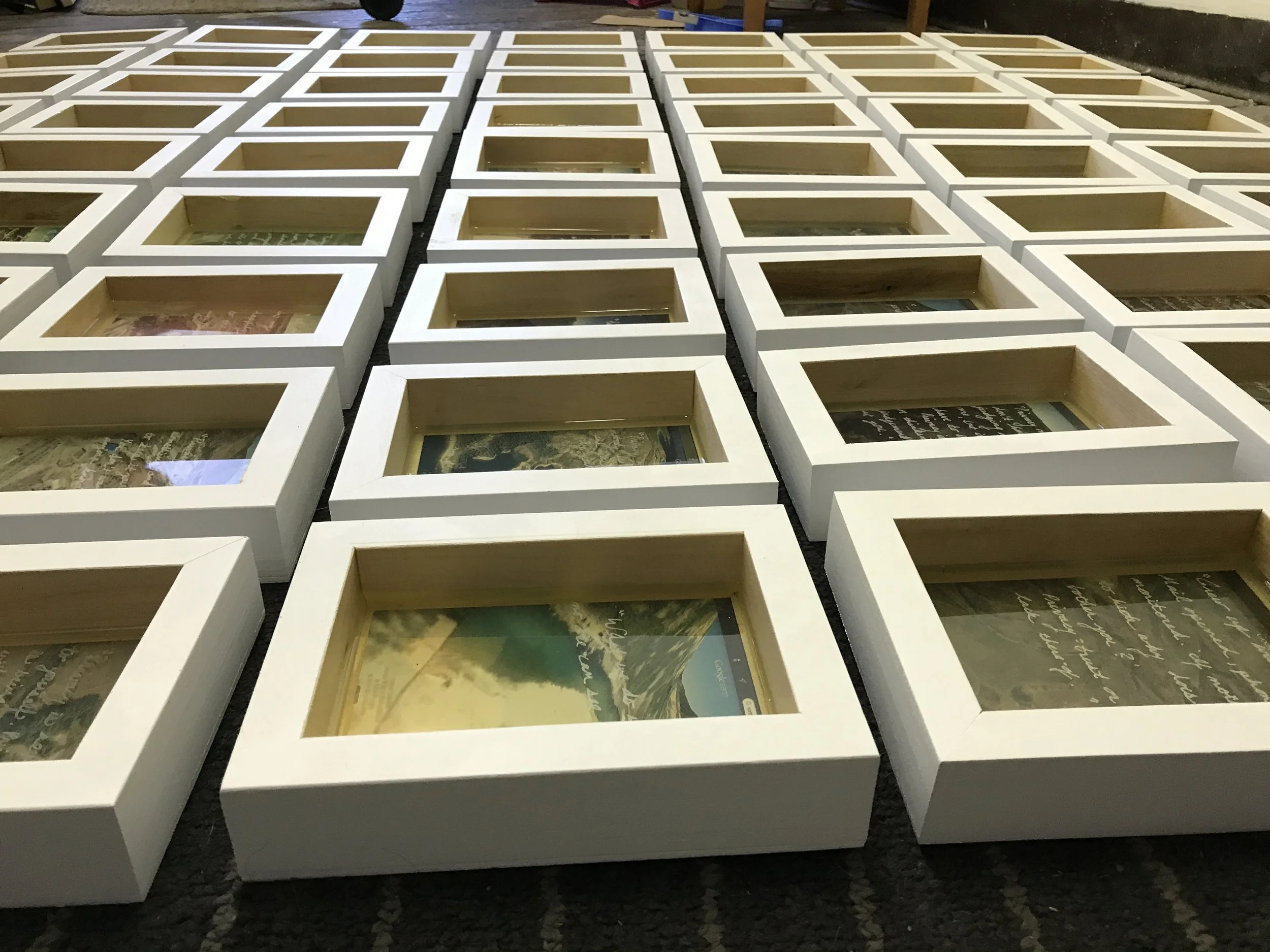 Photographs of landscapes in North Korea, taken using Google Earth, embedded in resin with quotes about privacy.